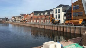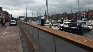 Die Self Closing Wave Barrier (SCWB) ist ein Brecherelement, das im nicht überfluteten Zustand vor Ort sicher an einem Deckel in einem im Boden eingelassenen Becken hängt. Bei Erreichen des Hochwassers sorgt ein Aktivierungspegel dafür, dass sich das Becken der SCWB zu füllen beginnt. Durch den Aufwärtsdruck des Wassers beginnt das Wellenbrecherelement aufwärts zu schwimmen. In dieser Phase sind die Gummistützringe rund, so dass die schwimmende Barriere frei aufschwimmen kann, wenn die schwimmende Barriere die obere Position erreicht hat. Die Gummistützen werden zwischen der oberen Anschlagplatte des Wellenbrecherelements und der unteren Anschlagplatte der schwimmenden Barriere zusammengedrückt. Dadurch werden die Gummistützen zusammengedrückt. Durch das Zusammendrücken der Gummistützen dehnen sich diese auf die Stellen aus und füllen den Raum zwischen dem Becken und der schwimmenden Barriere aus. Dadurch entsteht eine Klemmwirkung zwischen dem Becken und der schwimmenden Barriere sowohl auf der oberen als auch auf der unteren Seite. Dies gibt der Barriere den nötigen Halt, um den seitlichen Kräften der Wellen standzuhalten. Wenn sich das Wasser im Becken zurückzieht, gehen die schwimmende Barriere und die Gummistützen in ihre ursprüngliche runde Form zurück. Die schwimmende Barriere kann sich in ihre Ruheposition absenken.